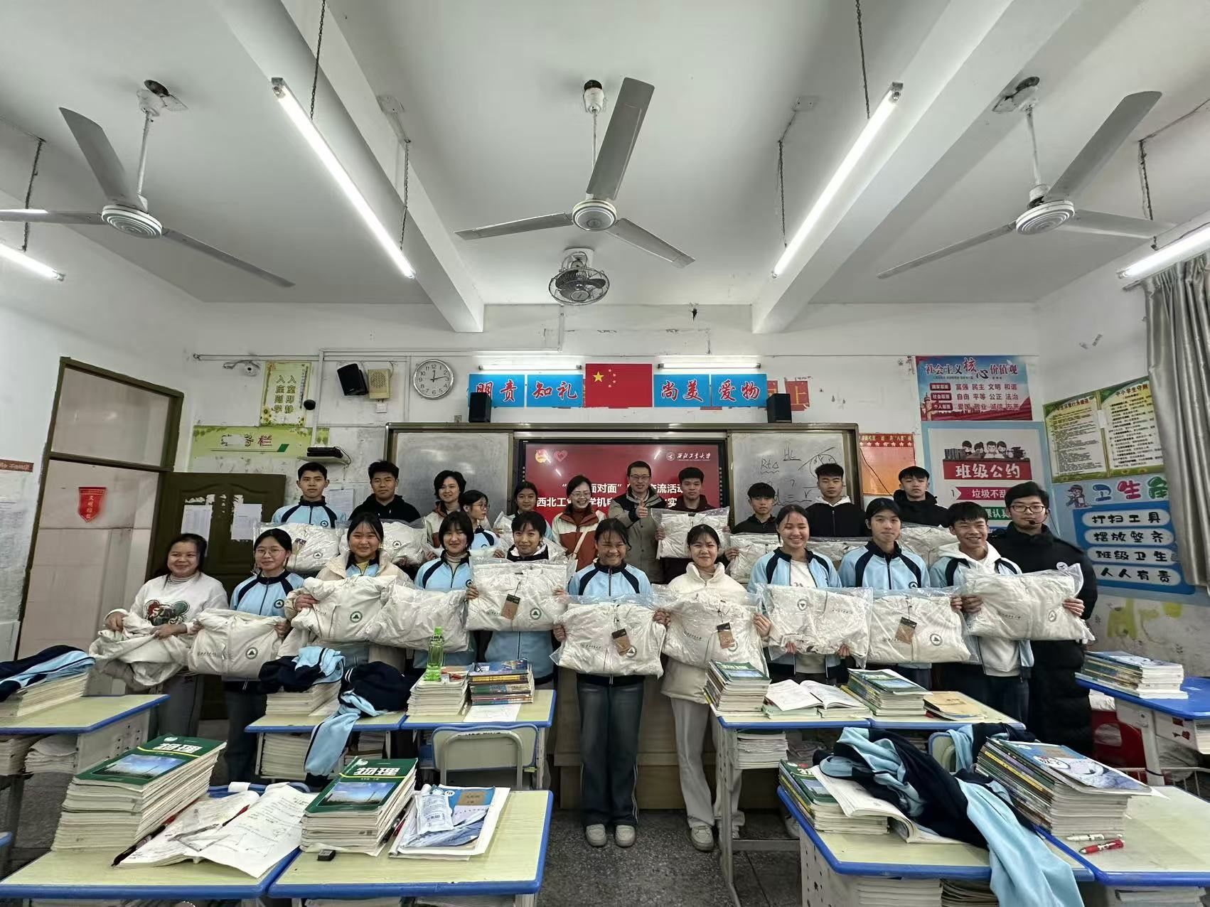 研究生支教团成员、学院2024届毕业生苏琼,与苏琼任教班级学生开展交流,为品学兼优的家庭经济困难学生发放御寒冬衣,并参观实验中学第十六届科技艺术节的学生作品展。