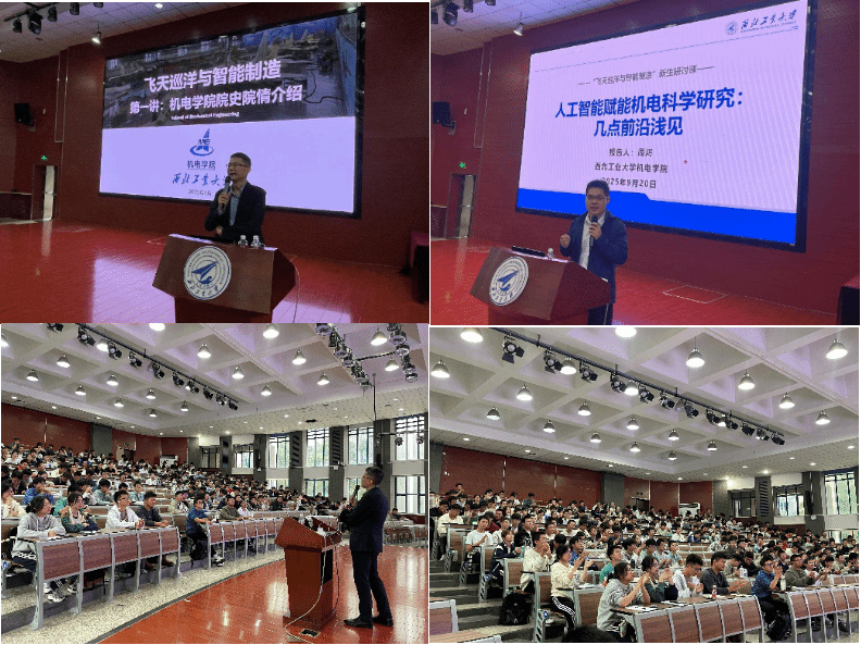 在人才培养方面的特色路径。他重点强调“机电管艺总师育人”的构建模式,如何培养学生具备机械力学基础扎实、电路控制知识牢固、管理协调能力突出、艺术美学素养兼备的复合型知识结构。同时用生动的案例介绍了机电学子“空天地海为国铸剑”来淬炼意志品质的能力提升路径。最后,常院长提出学院“百年百位中国飞行器总制造师”的宏伟愿景,勉励同学们好好学习,为国铸剑。精彩的讲述引发了同学们的强烈共鸣,教室内多次响起热烈掌声。