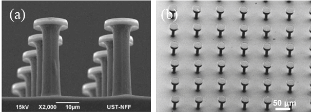 马炳和教授课题组通过光刻曝光精细设计,结合MEMS双层光刻剥离工艺,首次在双层光刻胶中获得了双凹型微结构空腔(图4),利用一步微复制工艺(图5)得到了PDMS(聚二甲基硅氧烷)基仿生柔性双凹型微阵列表面。本方案较目前已有的柔性双凹型微结构制备方法较大优势:双凹型微结构的垂直悬垂腔直接在光刻胶模具中一步浇筑获得,相应的聚合物基微结构具备高稳定性;基于光刻及光刻胶模具的加工方法可获得较大面积的柔性微结构表面,加工效率高,增强了实用性。