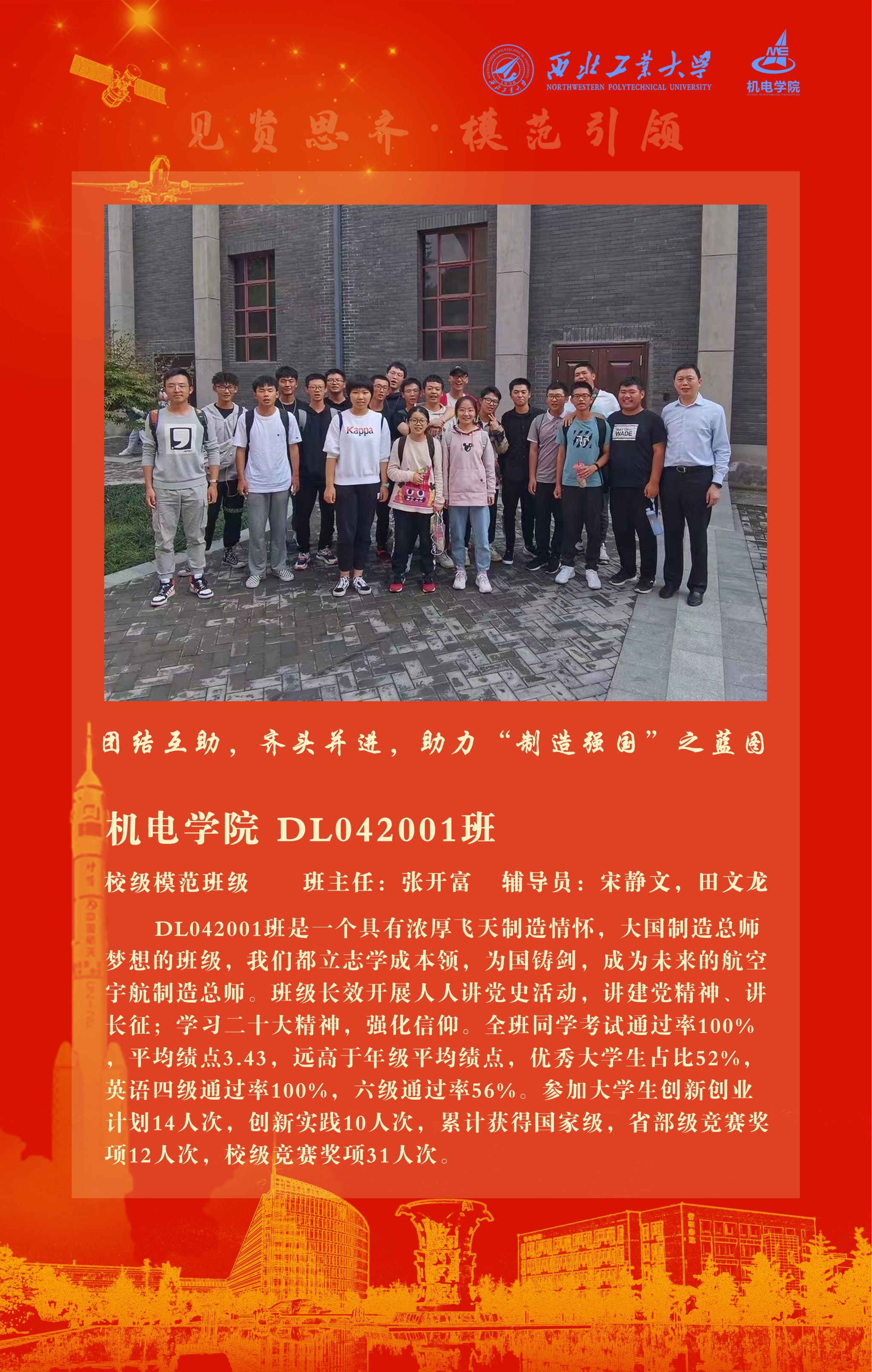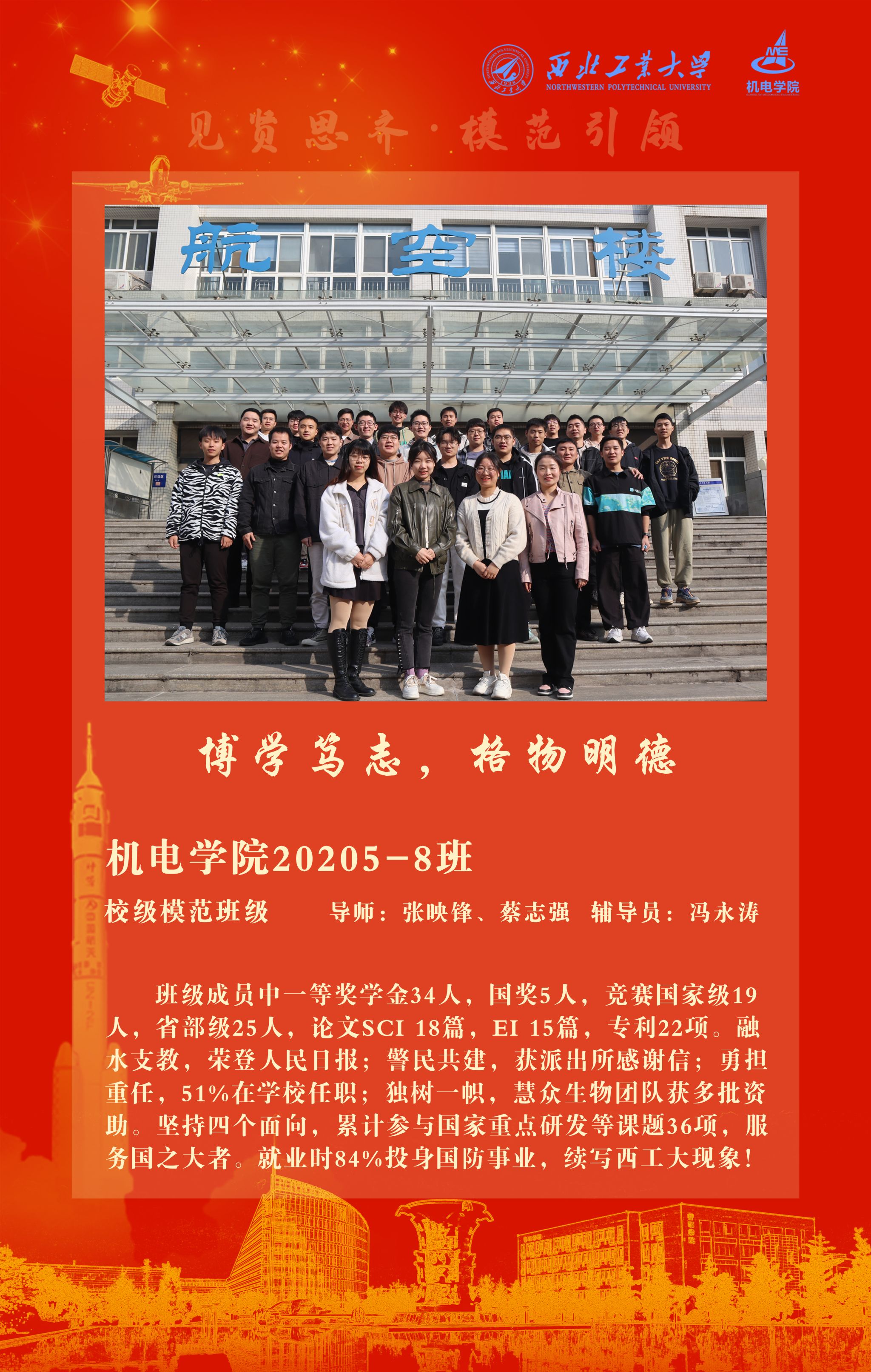 本、研各小班和全体学生在学习实践、科研创新和志愿服务中拼搏进取、精益求精、追求卓越,涌现出了一批先进集体和优秀个人,取得了丰硕成果。3个学生集体和13名学生在学校年度奖学金及荣誉称号评选中脱颖而出,创造佳绩,获得本科生模范班级1个、研究生模范班级1个、研究生模范导学团队1个、优秀大学生标兵1人、优秀研究生标兵1人、本科生单项之星3人、研究生单项奖2人、宝钢社会专项奖学金1人、小米特等奖学金1人、感恩近现代科学家奖学金1人、航空工业一等专项奖学金1人、中航技专项奖学金1人、三星专项奖学金1人。