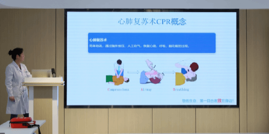 活动伊始,梁乐乐医生介绍了急救知识和急救技能的重要性,强调“黄金四分钟”对保障生命安全的关键作用。随后,医护人员详细讲解了人工呼吸和心肺复苏的操作步骤和注意事项,以及AED(自动体外除颤器)的使用方法,并通过模拟人体模型进行了现场示范。