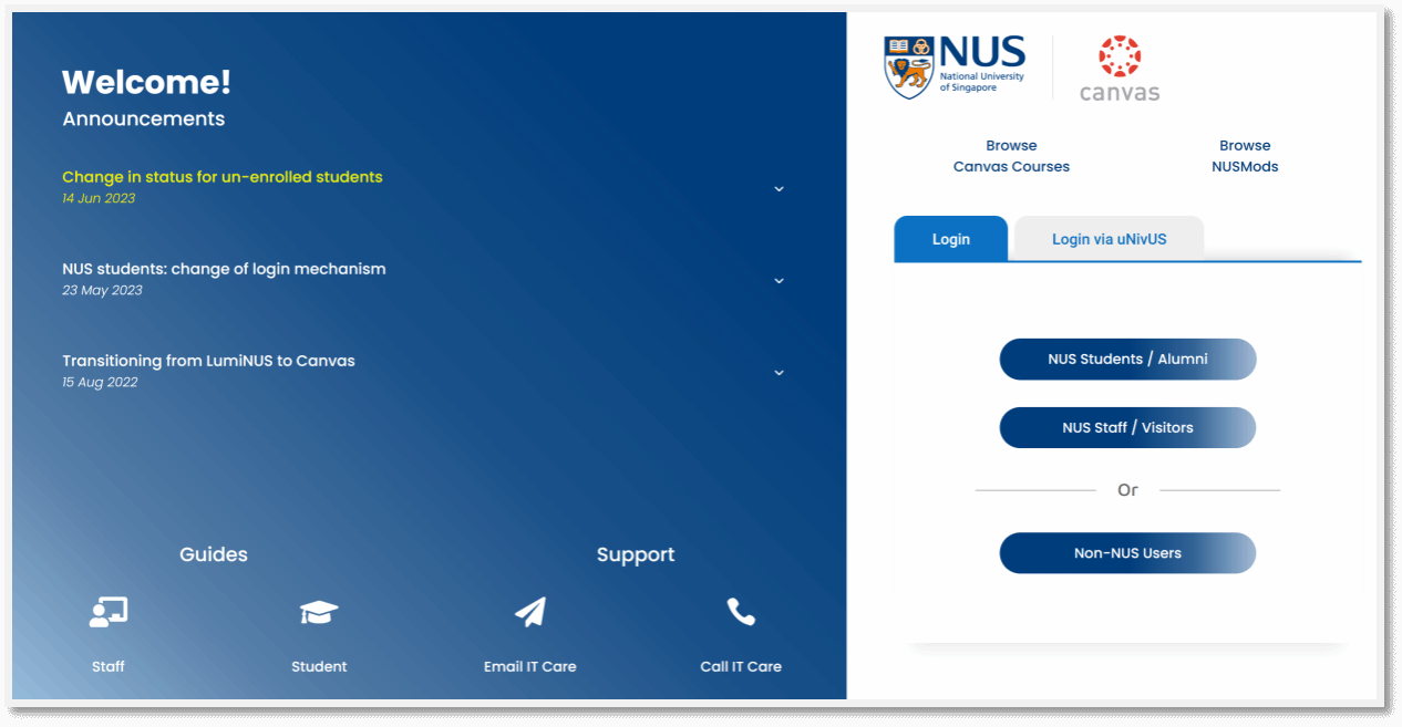 NUS will set up individual accounts for participants on the NUS online learning platform, Canvas. Each student will use their Canvas account to receive school notifications, access study tasks assigned by lecturers, submit assignments, and download course materials.