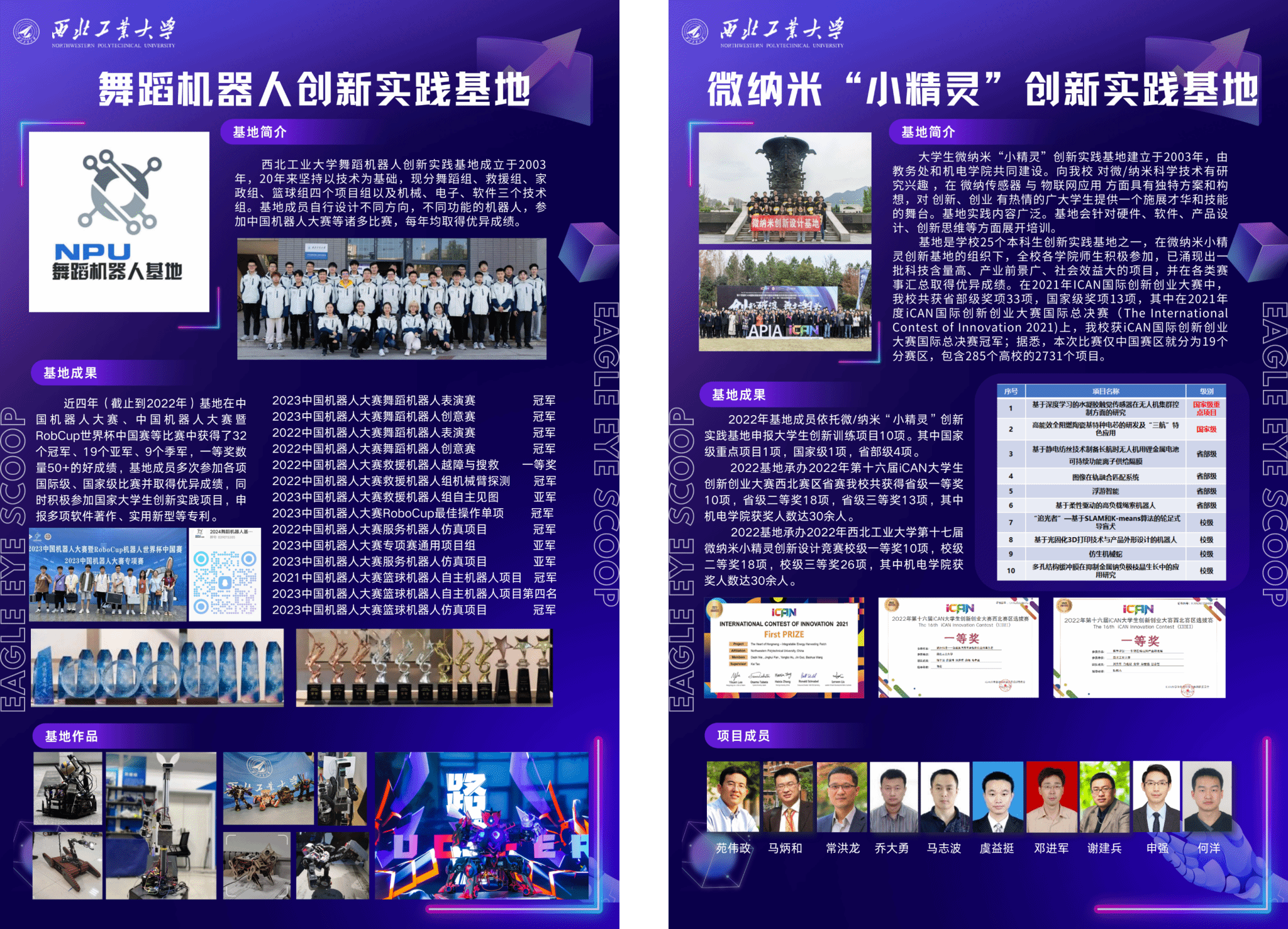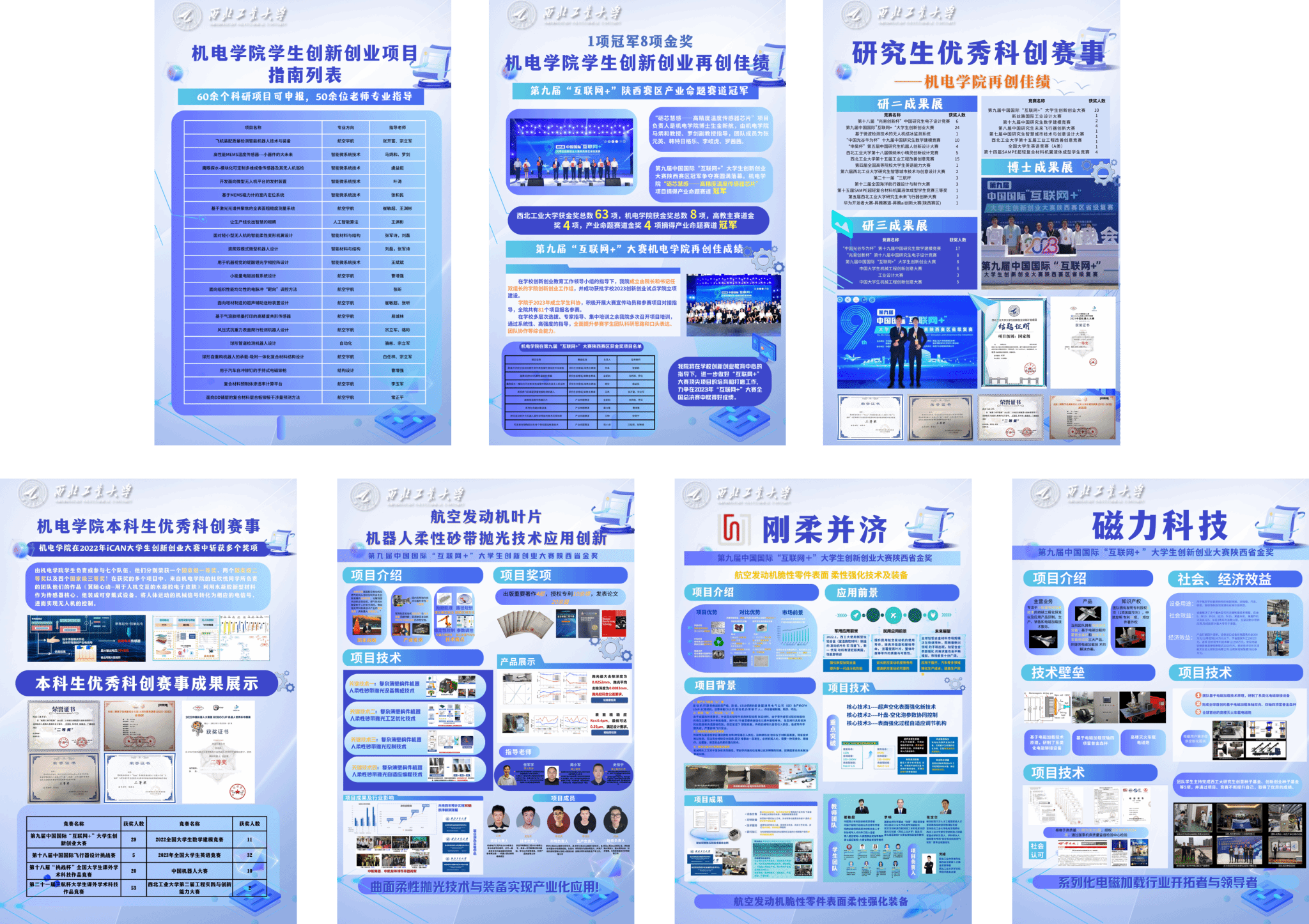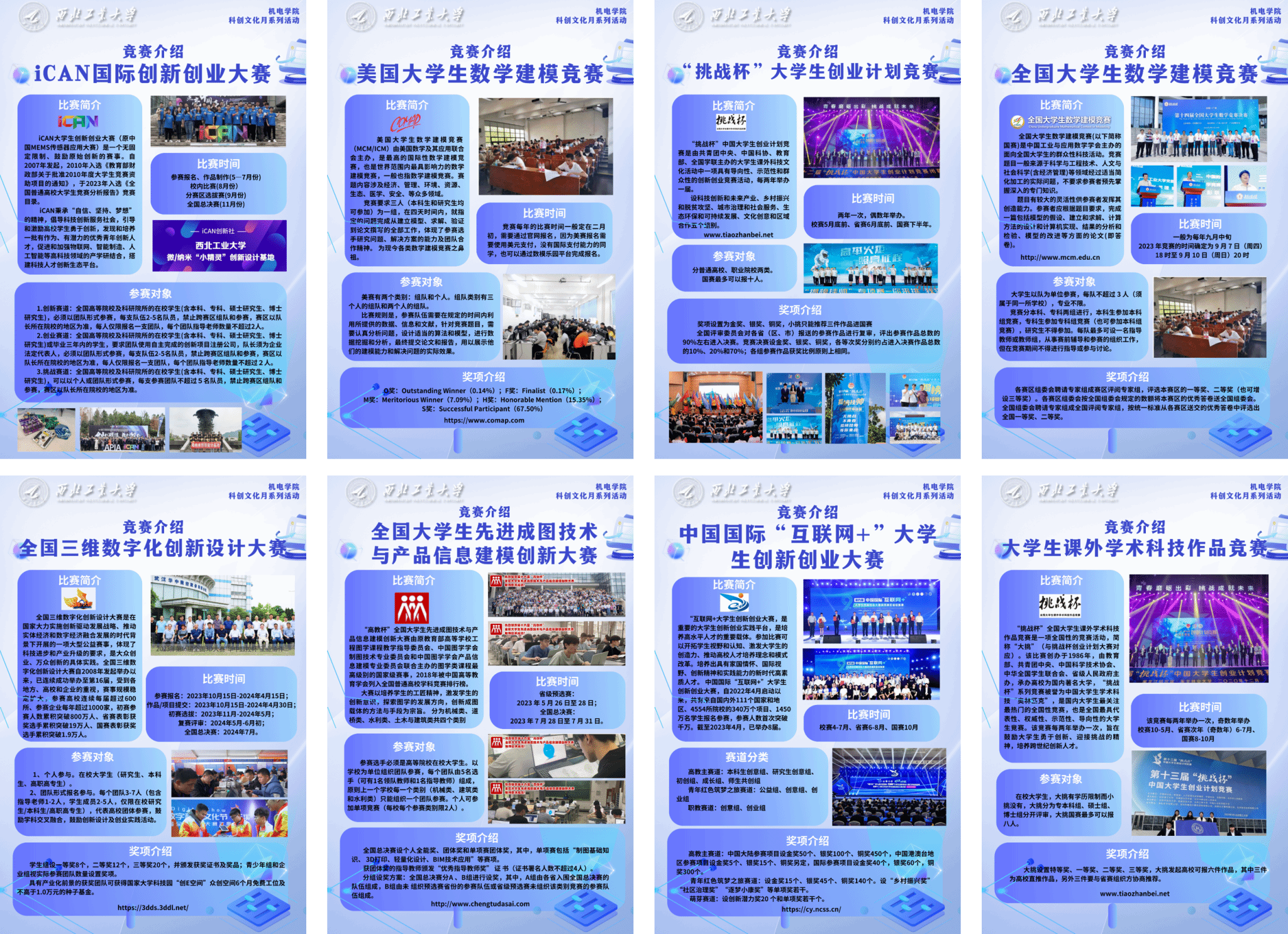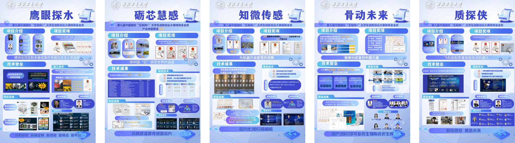 (3)活动简介:学院科创成果系列展览,包含第九届“互联网+”陕西省金奖项目、第八届“互联网+”国赛金奖项目、科创赛事介绍、科创基地介绍(舞蹈机器人基地、微纳米小精灵基地)等。
