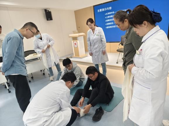 在创伤救护模块,内容进一步深入,涵盖了不同部位的止血方法(包括出血点判断、止血点按压、各种包扎技巧、骨折固定的基本原则以及安全搬运伤员的注意事项。最后,通过包扎演示及分组练习,学员们动手操作,熟练掌握了三角巾、绷带等器材的使用方法,现场学习氛围热烈。