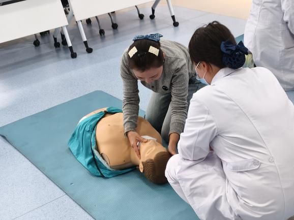 为巩固理论知识,培训设置了丰富的实操练习环节。在心肺复苏模型练习中,学员们在校医院老师的悉心指导下,亲身实践胸外按压、人工呼吸等动作,不断调整手法、力度和频率,力求操作规范到位。