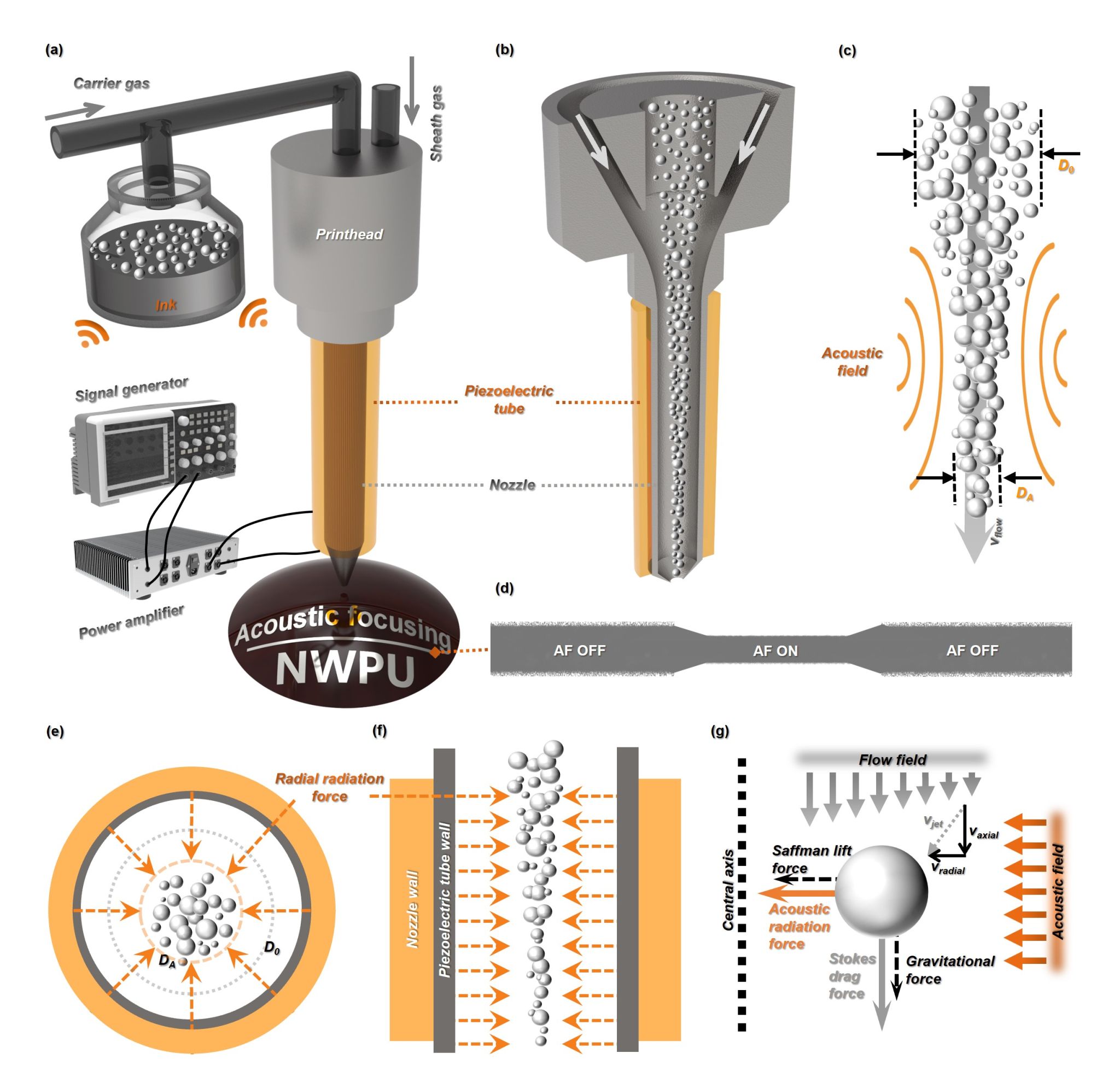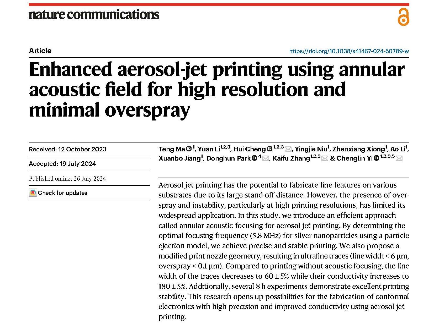 张开富教授团队在气溶胶喷墨打印方向取得了新进展,成功发展了外加声场辅助聚焦的超高精度气溶胶喷墨共形打印策略,突破了行业的极限分辨率,在高精度、高集成共形电子制造领域具有重要应用潜力,研究成果以“Enhanced aerosol-jet printing using annular acoustic field for high resolution and minimal overspray”为题发表在Nature Communications(2024, 15, 6317)上。论文第一作者为博士研究生马腾,通讯作者为张开富教授、程晖教授和易城林教授。原文链接://doi.org/10.1038/s41467-024-50789-w