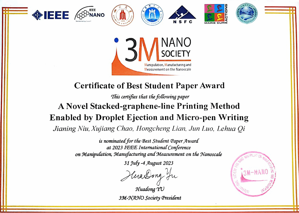 齐乐华教授团队提出一种联合均匀微滴喷射和微笔直写打印的多叠层石墨烯图案制备新方法,并成功地打印出含有多叠层石墨烯的微结构图案。该工作为具有空间结构的石墨烯图案打印提供了一种新颖方法。相关成果以题为“A novel stacked-graphene-line printing method enabled by droplet ejection and micro-pen writing”被IEEE 3M-NANO 2023国际会议录用并荣获“Best Student Paper Awards”。论文第一作者是团队在读研究生牛佳宁博士,通讯作者是晁许江副教授。本届会议共有三篇论文获奖,获奖率约为1%。该研究工作受到国家自然科学基金重点项目、深圳市自然科学基金基础研究面上项目和中国博士后科学基金支持。