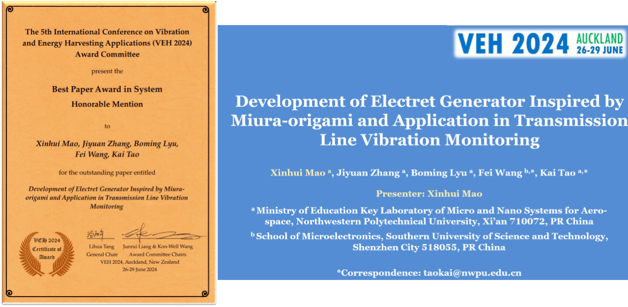 微系统工程系博士生毛新辉、硕士生张继元参加了此次大会。发表了题为“Development of Electret Generator Inspired by Miura-origami and Application in Transmission Line Vibration Monitoring”的口头报告,获得了参会人员的广泛好评,并获“VEH2024最佳论文奖”。