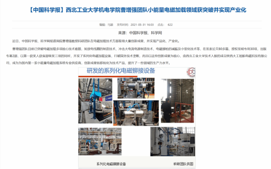 5.4.4【中国科学报】性奴 曹增强团队小能量电磁加载领域获突破并实现产业化